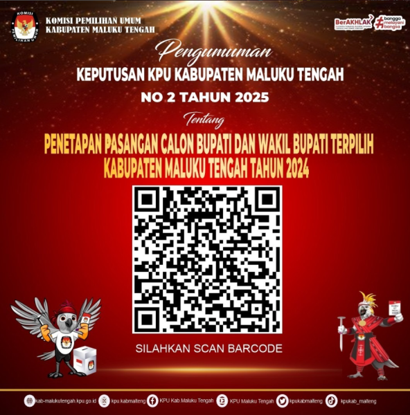 #TemanPemilih, Berikut kami sampaikan Pengumuman Penetapan Pasangan Calon Bupati dan Wakil Bupati Terpilih dalam Pemilihan Bupati dan Wakil Bupati Kabupaten Maluku Tengah Tahun 2024 berdasarkan Keputusan KPU Kabupaten Maluku tengah Nomor 2 Tahun 2025, selengkapnya dapat dilihat pada tautan/link dibawah ini.