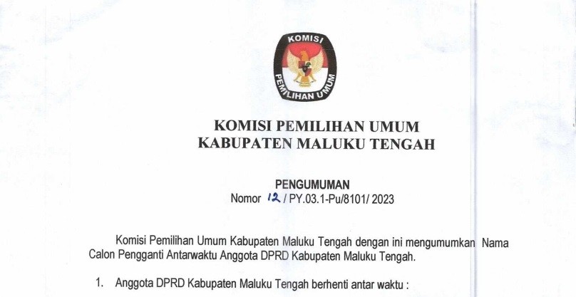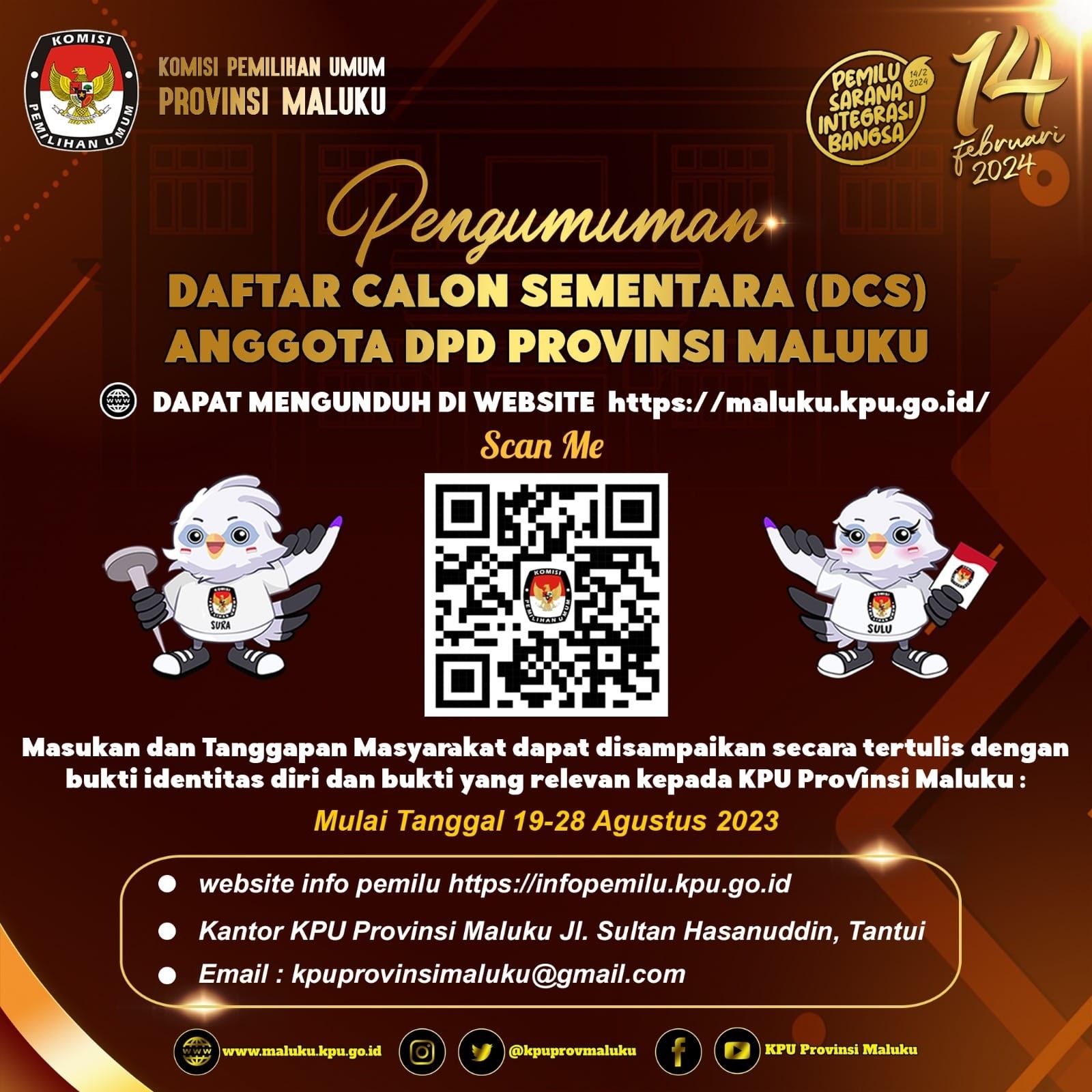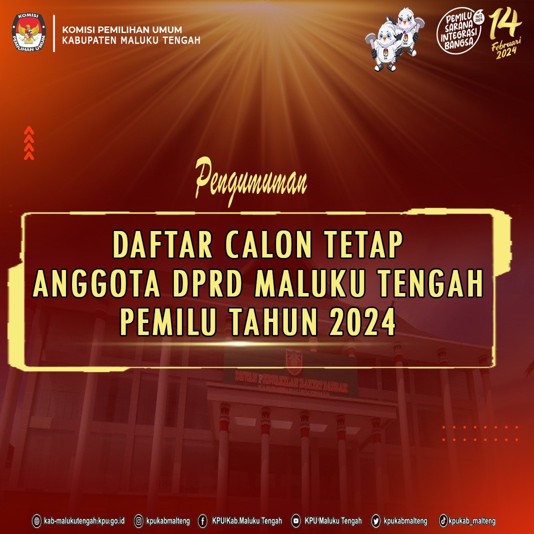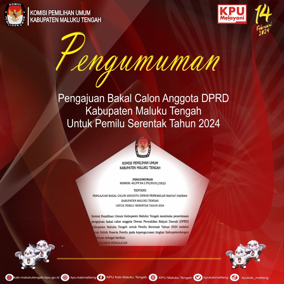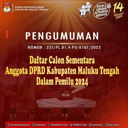 PENGUMUMUMAN NOMOR : 235/PL.01.4-PU/8101/2023 TENTANG DAFTAR CALON SEMENTARA ANGGOTA DPRD KABUPATEN MALUKU TENGAH DALAM PEMILIHAN UMUM TAHUN 2024 Bahwa untuk melaksanakan ketentuan Pasal 70 Peraturan KPU Nomor 10 Tahun 2023 tentang Pencalonan Anggota Dewan Perwakilan Rakyat, Dewan Perwakilan Rakyat Daerah Provinsi, dan Dewan Perwakilan Rakyat Daerah Kabupaten/Kota, KPU Kabupaten Maluku Tengah mengumumkan Daftar Calon Sementara (DCS) Anggota DPRD Kabupaten Maluku Tengah dan persentase keterwakilan perempuan dalam Daftar Calon Sementara (DCS) sebagaimana terlampir. Berkenaan dengan hal tersebut, sesuai dengan ketentuan Pasal 71 Peraturan KPU Nomor 10 Tahun 2023 tentang Pencalonan Anggota Dewan Perwakilan Rakyat, Dewan Perwakilan Rakyat Daerah Provinsi, dan Dewan Perwakilan Rakyat Daerah Kabupaten/Kota, bahwa masyarakat dapat menyampaikan masukan dan tanggapan terhadap calon sementara Anggota DPR, DPRD provinsi, dan DPRD kabupaten/kota yang tercantum dalam Daftar Calon Sementara (DCS) dari tanggal 19 - 28 Agustus 2023. Untuk mendapatkan masukan dan tanggapan Masyarakat, memperhatikan hal-hal tersebut: Masukan dan tanggapan masyarakat disampaikan secara tertulis terkait dengan pemenuhan persyaratan administrasi bakal calon anggota DPR, DPRD Provinsi dan DPRD Kabupaten/Kota Masukan dan tanggapan masyarakat disertai dengan bukti identitas diri dan bukti yang relevan kepada KPU Kabupaten Maluku Tengah melalui: website info pemilu KPU yaitu https://infopemilu.kpu.go.id kantor KPU Kabupaten Maluku Tengah dengan alamat JL. R A KARTINI email : helpdeskkpumalteng@gmail.com\ Informasi lebih lanjut dapat menghubungi helpdesk pencalonan KPU Kabupaten Maluku Tengah Demikian untuk menjadi maklum, terima kasih. PENGUMUMAN LENGKAPNYA : DOWNLOAD DISINI SK DAN LAMPIRAN SK DCS : DOWNLOAD DISINI Untuk Memberi Tanggapan Masyarakat : KLIK DISINI