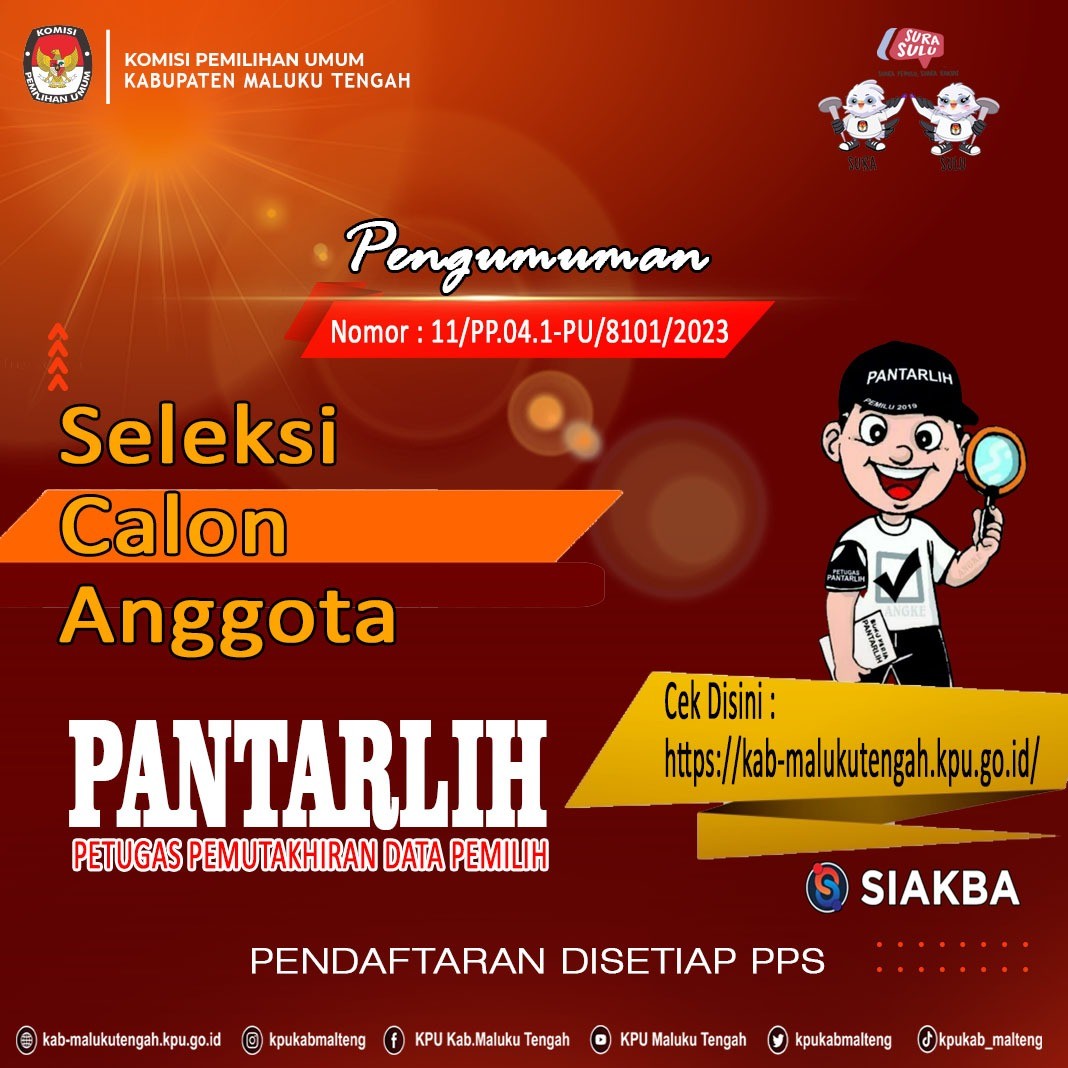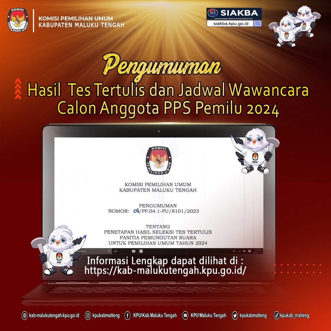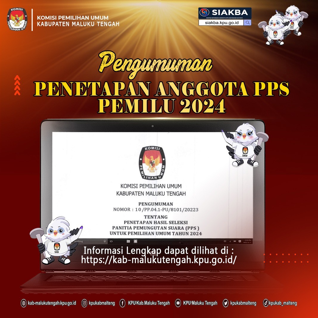 KPU Kabupaten Maluku Tengah menetapkan calon Anggota Panitia Pemungutan Suara untuk pemilihan Umum Tahun 2024, Peringkat 1-3 ditetapkan sebagai calon anggota Panitia Pemungutan Suara yang terpilih dan calon anggota Panitia Pemungutan Suara peringkat 4-6 sebagai Calon Pengganti antar Waktu anggota Panitia Pemungutan Suara Sebagaimana daftar Terlampir.