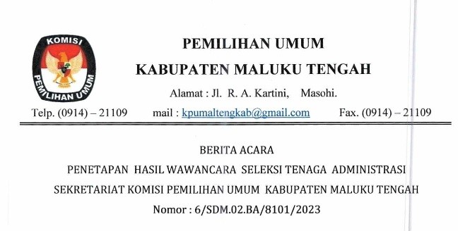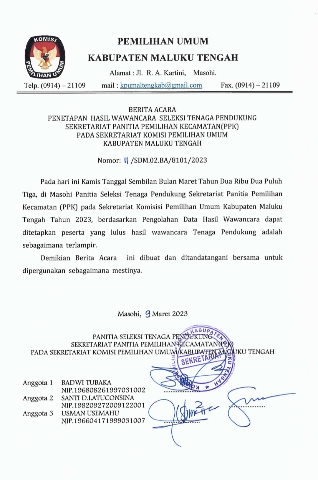 Berdasarkan Berita acara Rapat Pleno KPU Kabupaten Maluku Tengah Nomor /PP.04.1-BA/8101/2022 tanggal 23 Januari 2023 tentang Rapat Pleno Penetapan Hasil Seleksi Panitia Pemungutan Suara untuk Pemilihan Umum Tahun 2024, disampaikan hal-hal sebagai berikut: