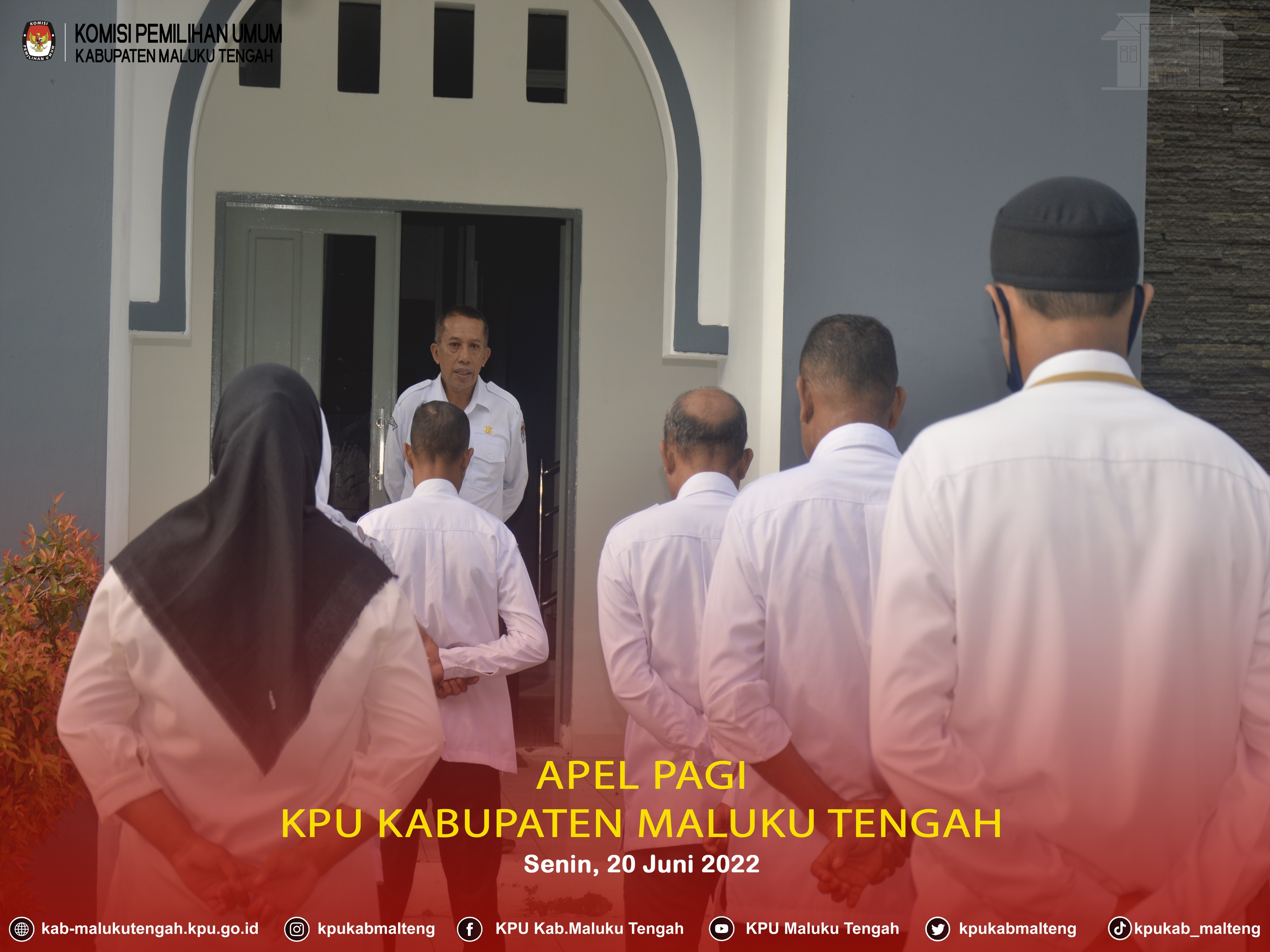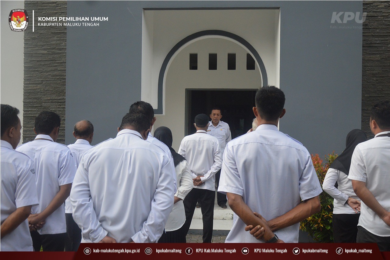 Masohi - Senin (27/06) Pelaksanaan apel pagi hari ini dilaksanakan oleh seluruh pegawai Kantor Komisi Pemilihan Umum Kabupaten Maluku Tengah seperti biasanya. Hal ini merupakan kewajiban bagi setiap pegawai, selain untuk mendengar arahan Pembina apel pagi juga bermanfaat untuk melatih kedisiplinan dan tanggung jawab bagi setiap Pegawai. Seperti apel pagi yang dilaksanakan dimanapun, ini merupakan sarana untuk melatih kedisiplinan mengenai waktu serta tanggung jawab, apel pagi dilaksanakan seperti biasa pada pukul 08.00 WIT. Pembina Apel pagi ini adalah PLT Sekretaris KPU Kabupaten Maluku Tengah, Badwi Tubaka. Mengawali arahannya PLT Sekretaris menyampaikan agar disiplin dan tanggung jawab dalam bekerja tetap dijaga, apalagi kita telah memasuki Tahapan Pemilu 2024. Selanjutnya Sekretaris juga menyampaikan apresiasi terhadap seluruh staf baik PNS maupun PPNPN karena telah melaksanakan tugas dengan baik, sesuai dengan Surat Edaran Sekretariat Jenderal Komisi Pemilihan Umum Republik Indonesia Nomor 5 Tahun 2022 tentang Sistem Kerja Pegawai dilingkungan Sekretariat Komisi Pemilihan Umum Kabupaten/Kota pada masa Tahapan Pemilu dan Pemilihan Serentak Tahun 2024. Apel Pagi diakhiri dengan doa sebelum semuanya kembali beraktifitas.